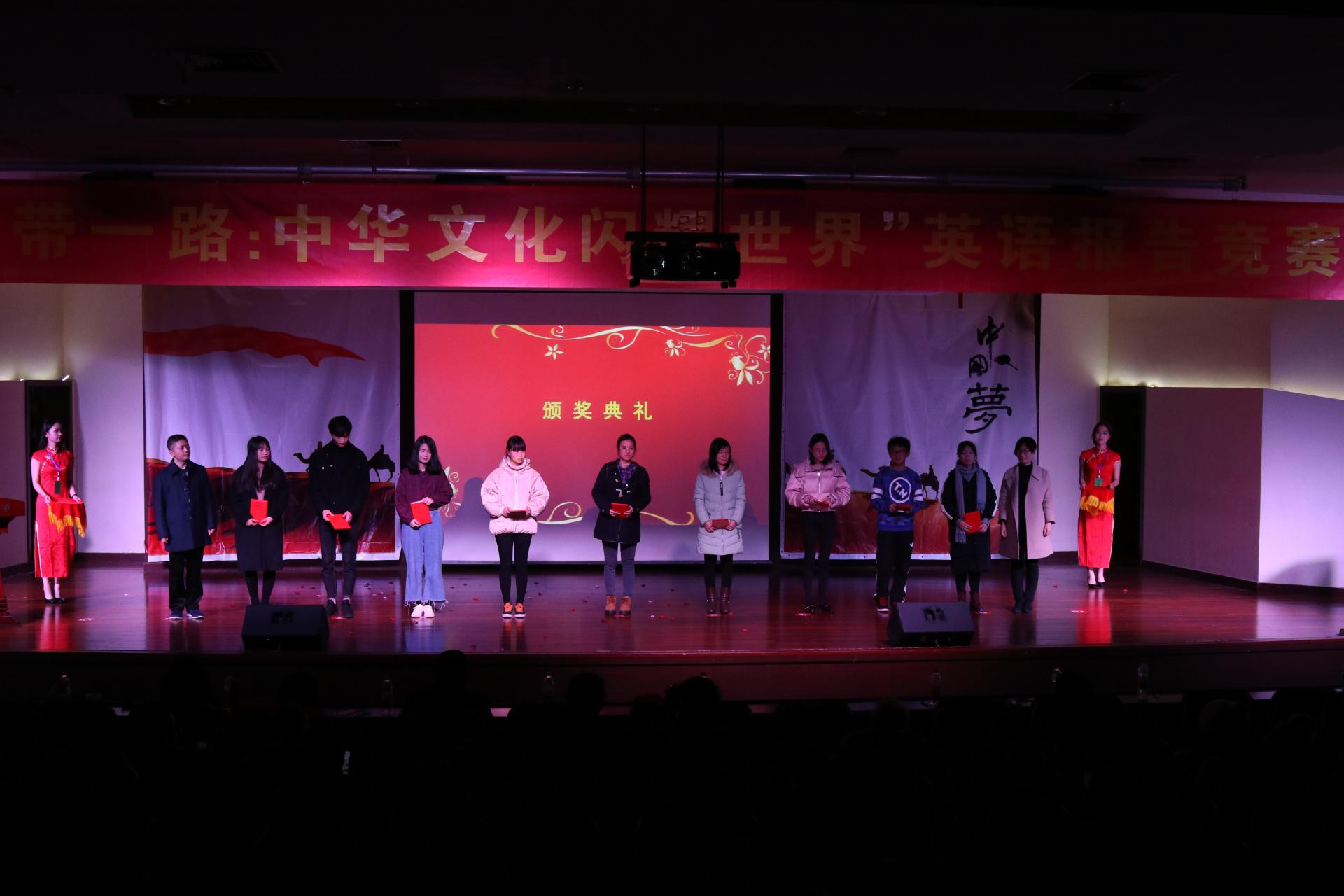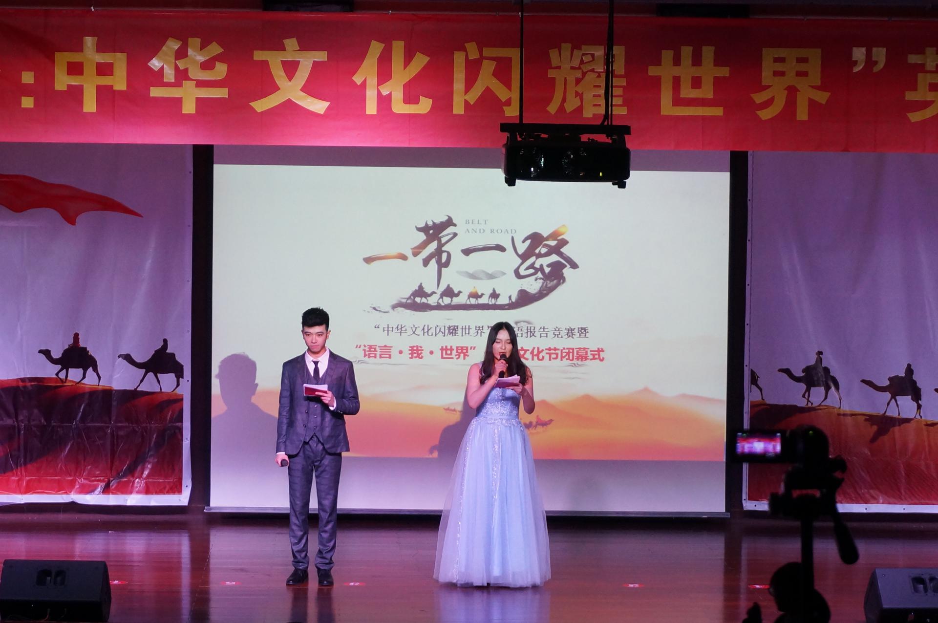 12月14日下午,我校“一带一路:中华文化闪耀世界”英语报告竞赛暨“语言·我·世界”第二届外语文化节闭幕式在学术一报隆重举行。校党委学生处副处长、党委学工部副部长吴翼泽,校研究生院副院长、党委研工部副部长张梅芳,学院党政领导出席本次活动;国际学院副院长李汉强、9001诚信金沙英语系副主任徐莎莎、商务英语系副主任孙久荣老师、英语演讲指导老师杨晨音、大外部副主任滕超、外教Mark担任本次竞赛的评委,来自国际学院的18个国家近40名外国学生组成留学生评委团,600位师生参加活动。