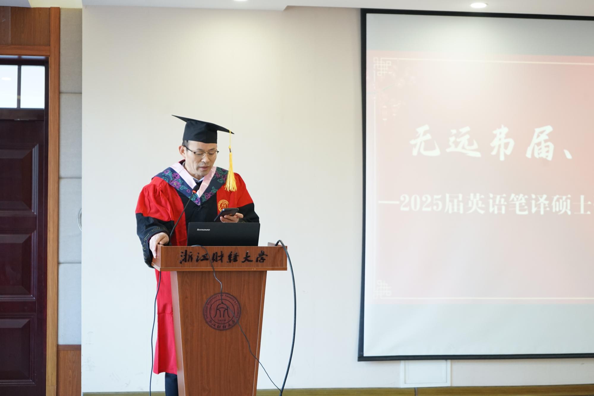 在致辞中,陶久胜院长向全体毕业生致以热烈的祝贺与真挚的祝愿。他寄语毕业生,以真诚之心待人,以笃志之心立业,以感恩之心处世。陶院长勉励全体毕业生,无论选择继续深造,还是投身职场,都应以积极的心态面对挑战,善用语言这一桥梁,胸怀世界格局,不畏挫折,砥砺前行。