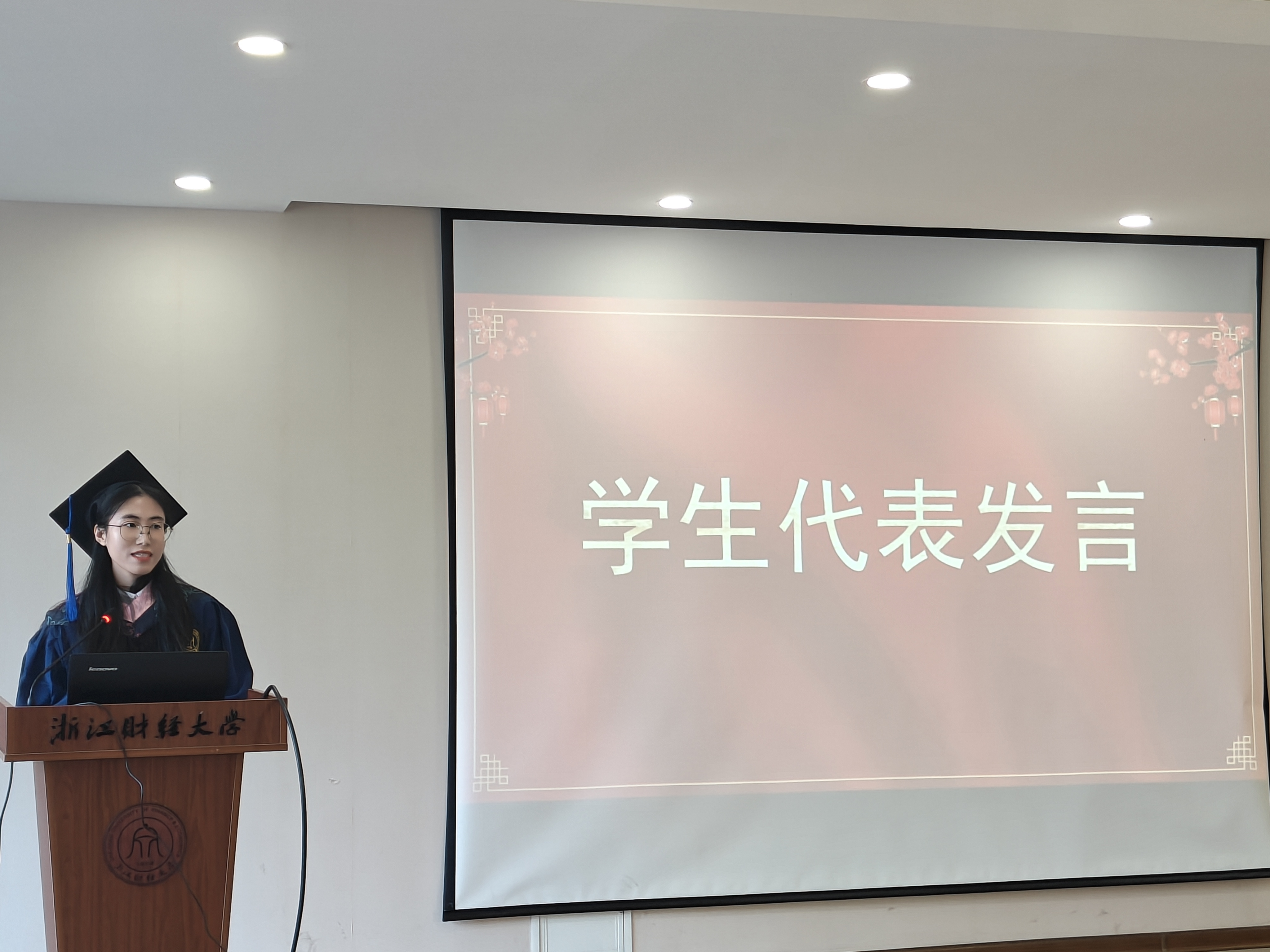毕业生代表黄芳在发言中深情流露对学院和导师的感恩之情。她感慨,三年的求学旅程,如一场春风细雨悄然润泽心灵,不仅铸就坚实的专业底蕴,更镌刻下责任与担当的烙印。她表示,展望未来,无论身在何方,都愿以赤子的热忱托举梦想,以家国的深情连接四方。她真挚地祝福,愿各位同窗与学院携手并肩,带着今日的光辉与温暖,在崭新的征程中,在岁月的长河里,步履不停,共谱华章。